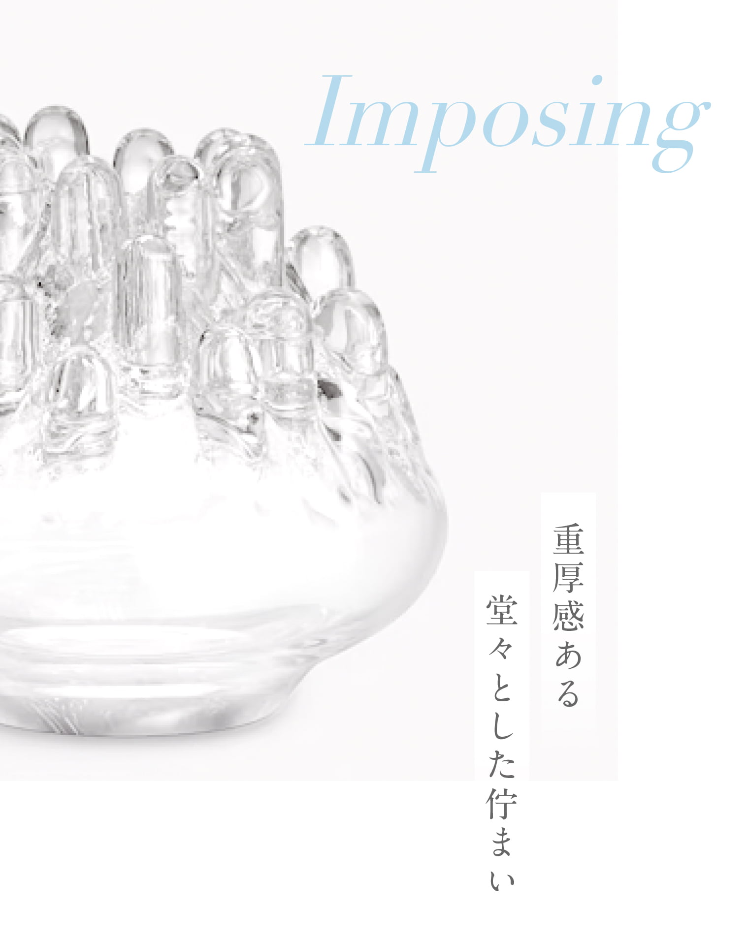 氷柱が幾重にもなったようなクリスタルの透明なキャンドルホルダーは、重厚感があり、置物としても存在感を放つデザインです。